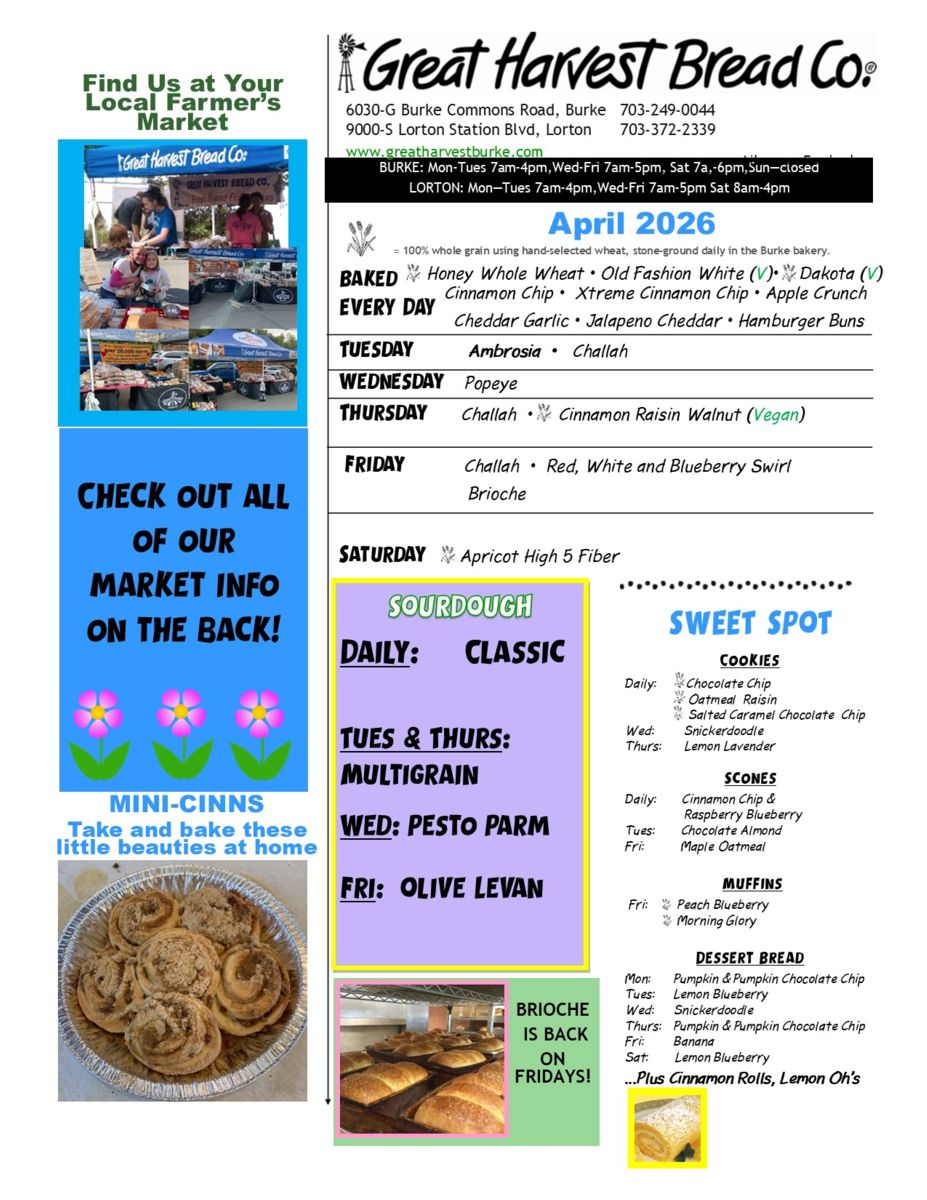 At our Lorton location, enjoy freshly baked, made-from-scratch bread, scones, cookies, muffins, and other daily delights. Pair your treat with a coffee, espresso, or smoothie, and relax in our cozy seating area with a fabulous soundtrack to enhance your visit.